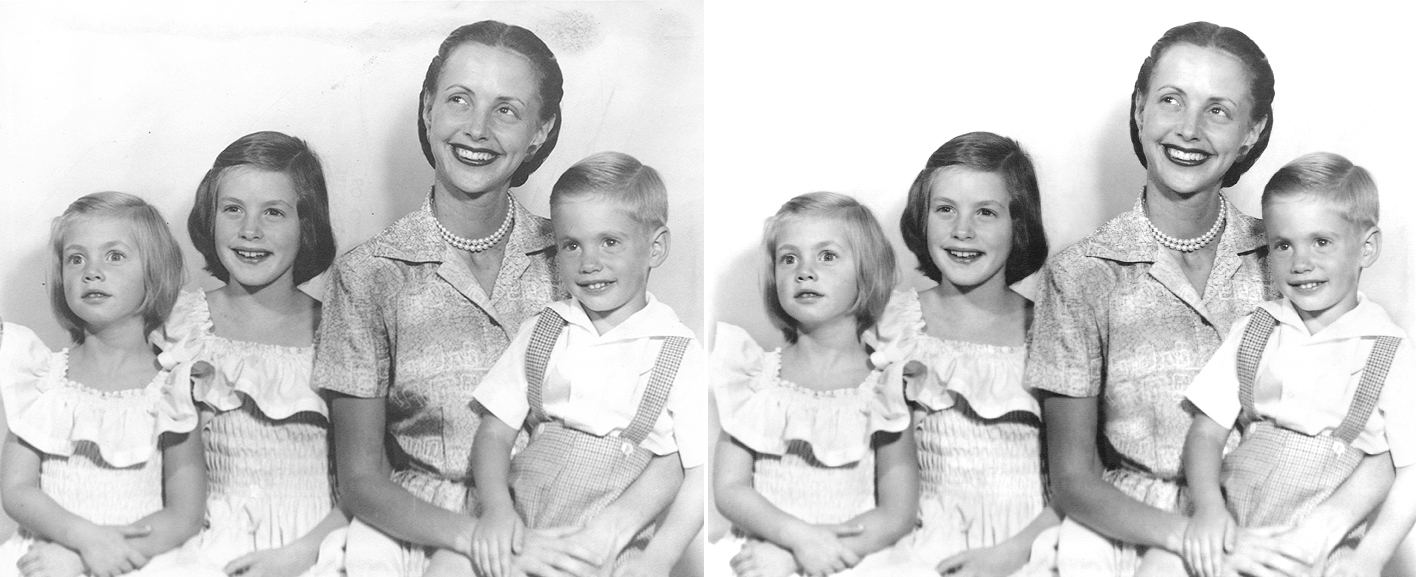 This early airbrush rendering was a family heirloom dating back to the beginning of the last century. The piece was too fragile to remove from the frame for scanning, and so we photographed it and retouched the resulting digital file. This enabled us to return the original to be safely stored away. When retouching was finished, the file was sent out for printing on a fine, acid-free watercolor paper (Rives BFK), ensuring that this favorite family image will last for many years to come!