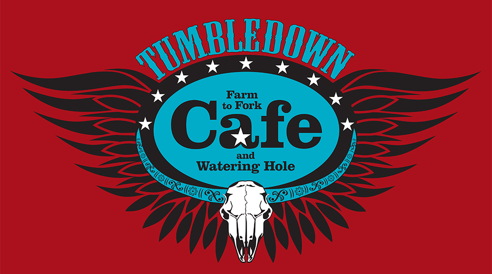 Tumbledown Cafe Logo: The Tumbledown Cafe in Sanbornville, NH is an outgrowth of nearby Tumbledown Farms, featuring fresh, local ingredients, and a variety of events catering to the local population. Requirements for this design included featuring the Scottish Highland cow horns (a breed raised at the farm), a nod to motorcycle fans (the proprietors are bikers, as are many of their employees and clientele), and a patriotic feel.